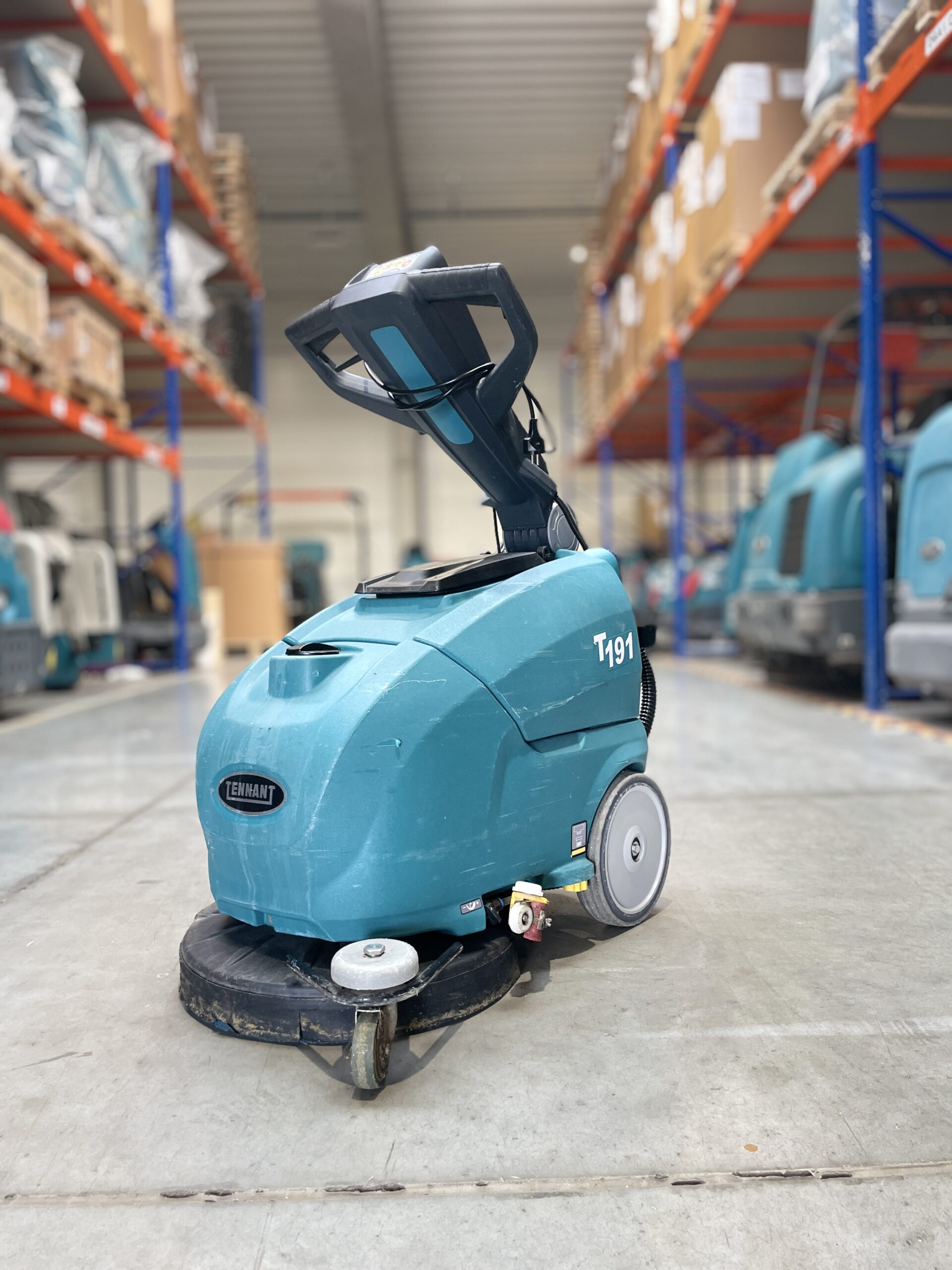 De Tennant T191 is een kleine, batterij-aangedreven walk-behind schrobmachine voor het snel en efficiënt reinigen van kleine tot middelgrote vloeren. Dankzij het compacte formaat manoeuvreert de T191 moeiteloos in smalle gangen, tussen stellingen en op moeilijk bereikbare plekken.